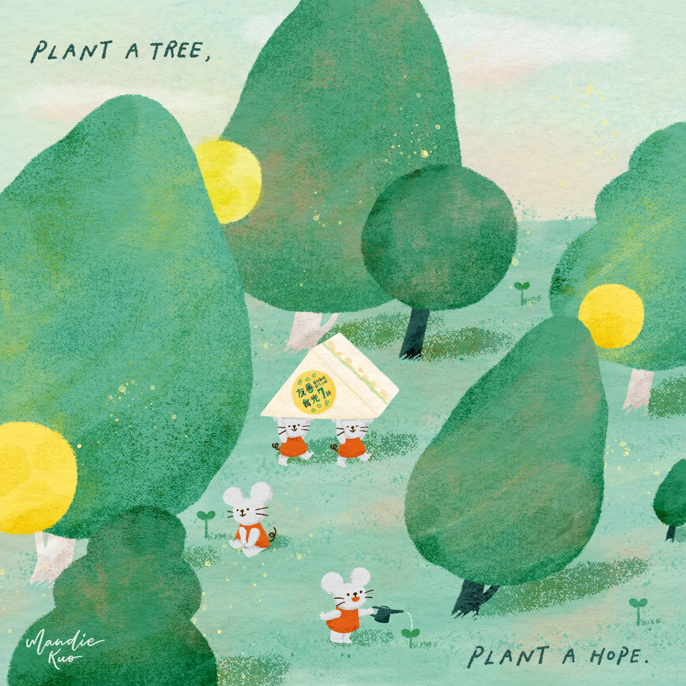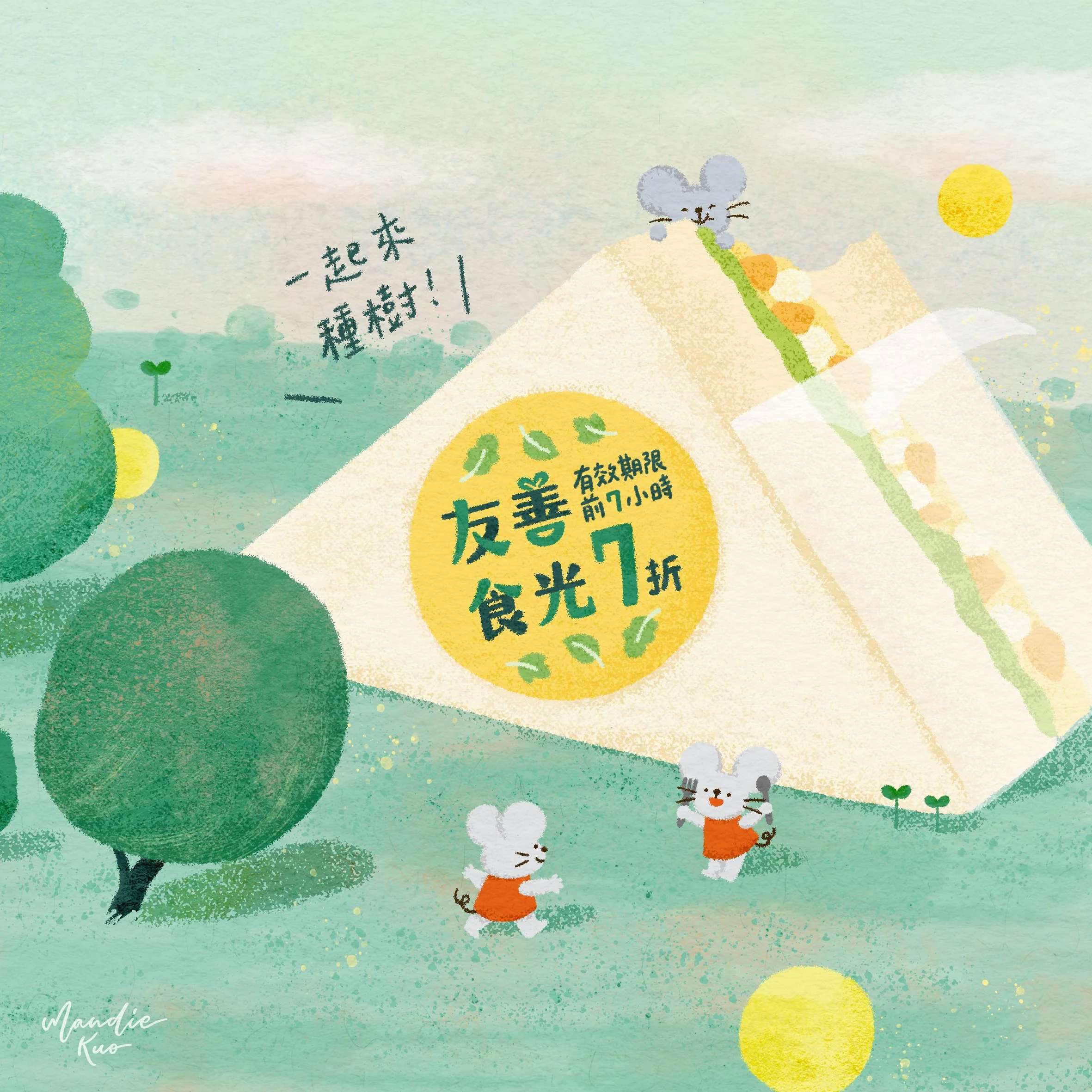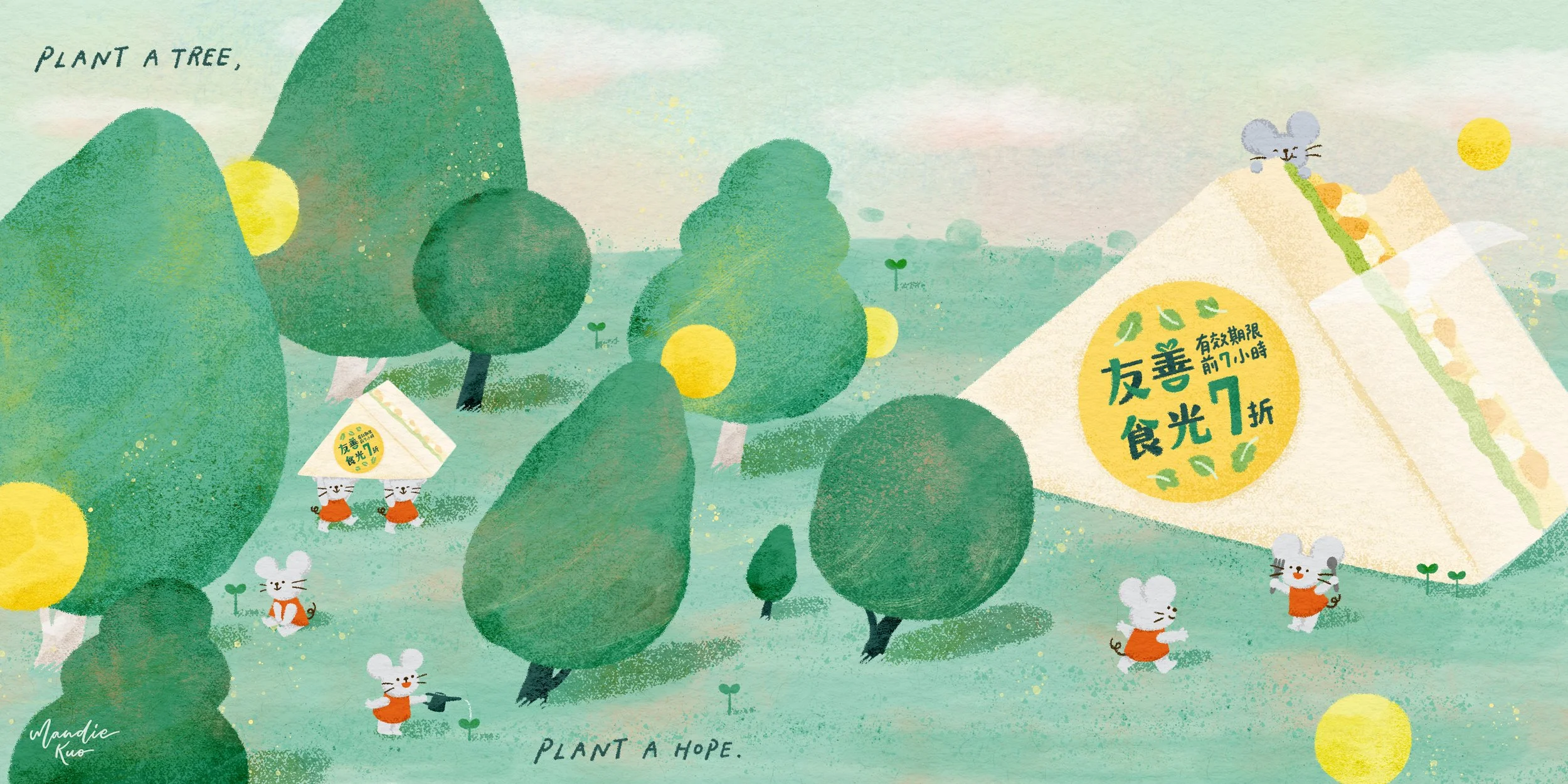 與全家便利商店合作,繪製全家「友善食光」的相關宣導插畫。結合響應世界森林日,以綠意盎然的氛圍為主軸,呈現出環保與自然的意向。