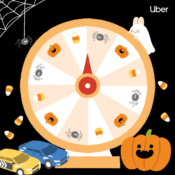 為Uber的萬聖節乘車優惠設計的campaign,融合了萬聖節會出現的各種元素,繪製出可以抽乘車優惠碼的驚喜轉盤,讓使用者可以點擊抽獎、領取優惠碼。