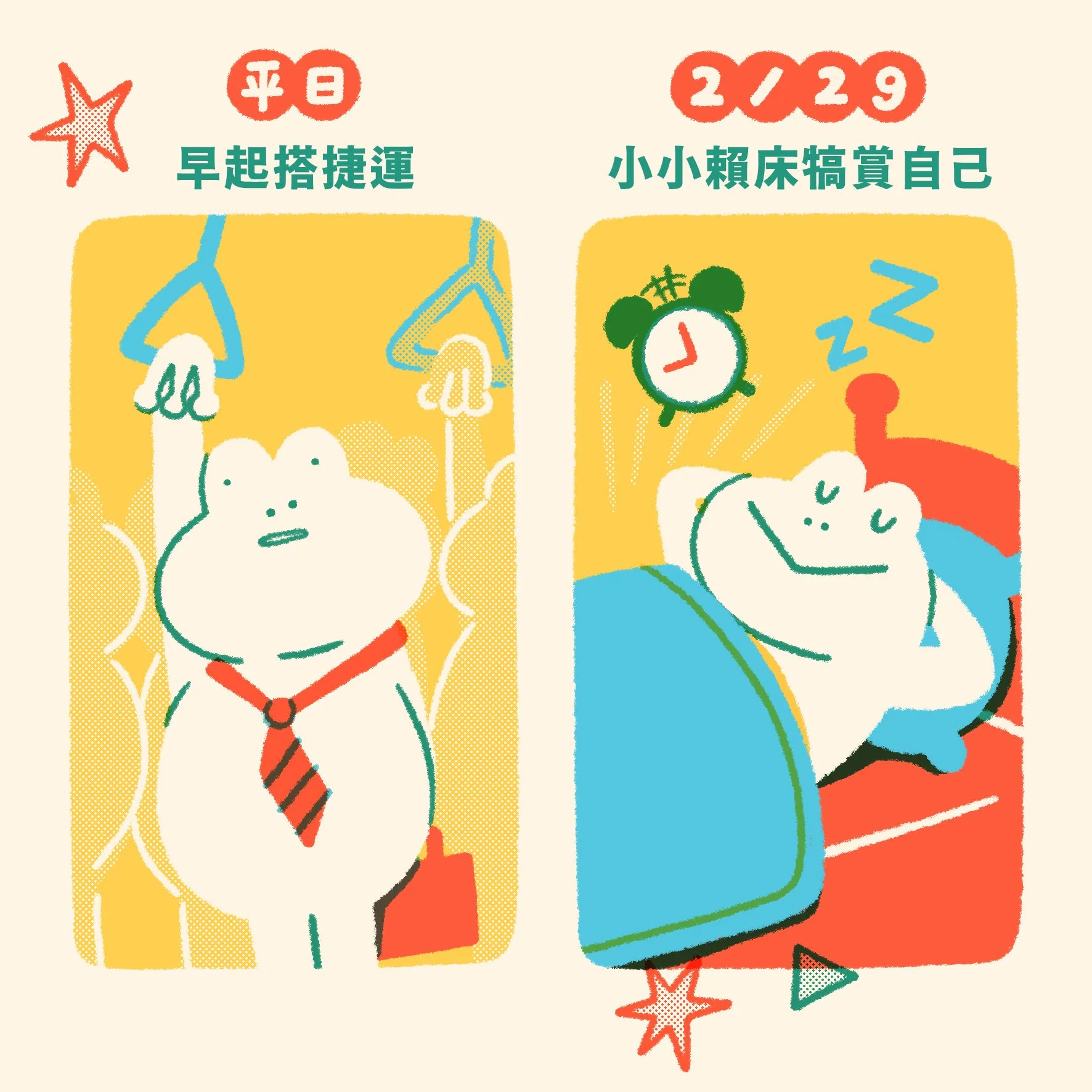 乘車優惠campaign提供了一天當中四個時段的優惠碼,依據時段繪製了四種不同的情境。在每個情境中呈現了平日及2/29的對比,一邊是枯燥煩悶的上班日常、一邊是小小叛逆獲得的快樂時光。