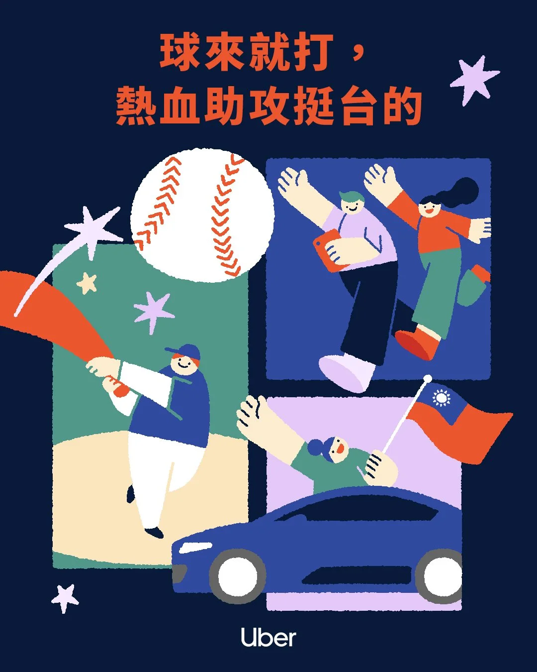 This series of promotional visuals was created for Uber in support of the 2026 World Baseball Classic, illustrated in a comic-style format that captures dynamic scenes including a baseball swing, riding to the stadium to watch the game, and imagery expressing support for Team Taiwan.